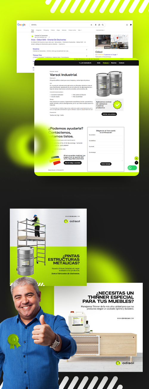 Diseñamos e implementamos un sitio web moderno con enfoque UI/UX, adecuado a la identidad técnica e industrial de Odisol. Creamos un catálogo virtual interactivo con descripciones, especificaciones técnicas y precios, acompañado de un sistema de cotización en línea. Además, integramos un botón de contacto vía WhatsApp y activamos Google My Business para mejorar visibilidad local y aparecer en búsquedas relevantes.